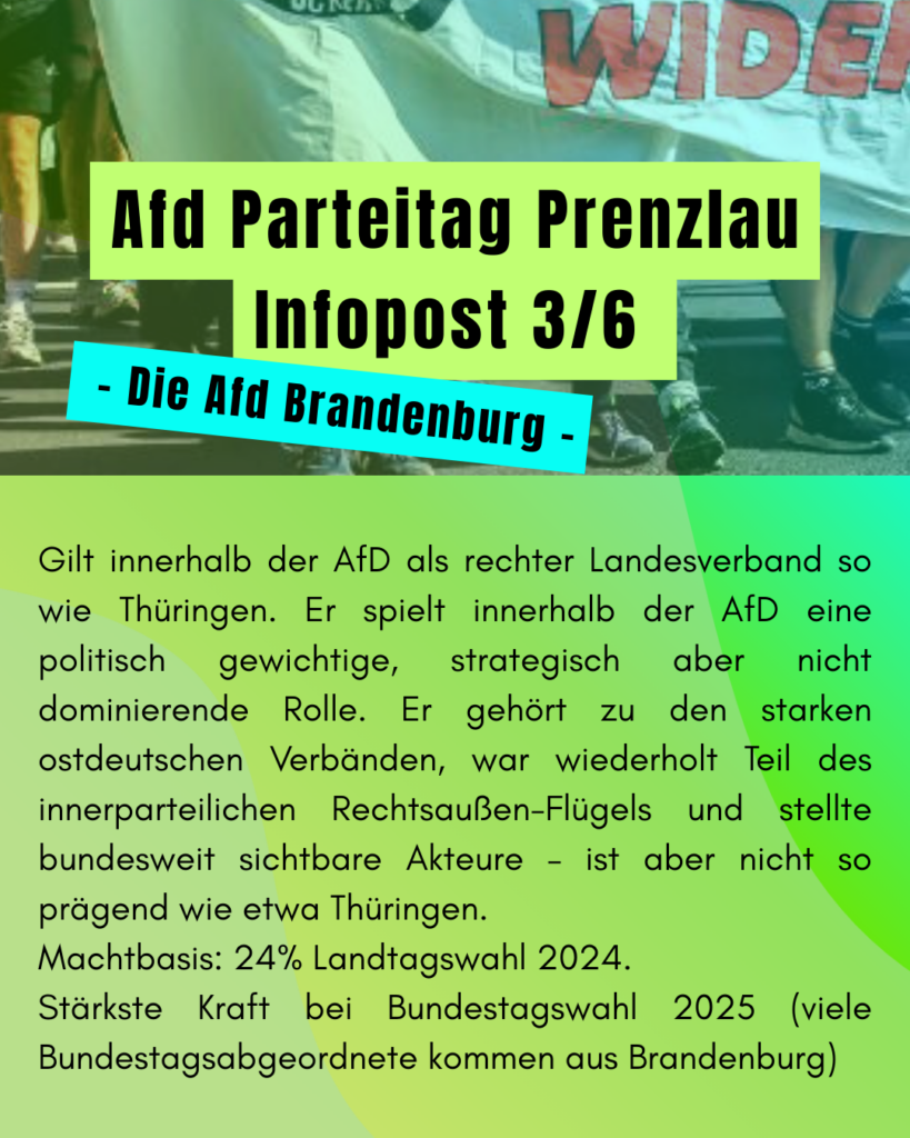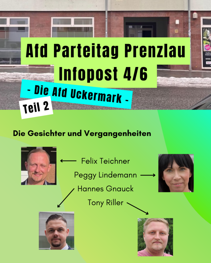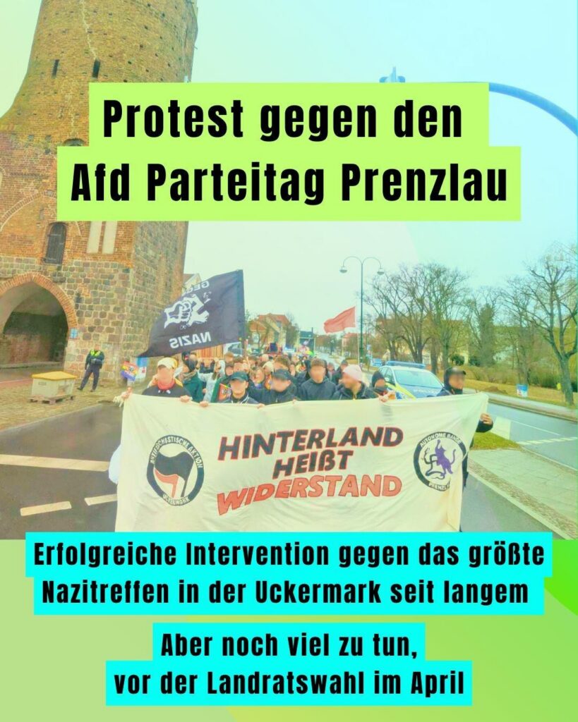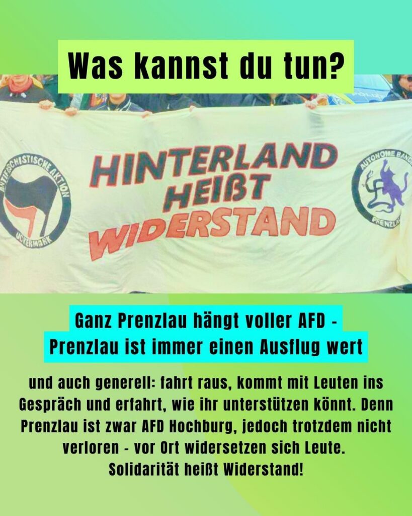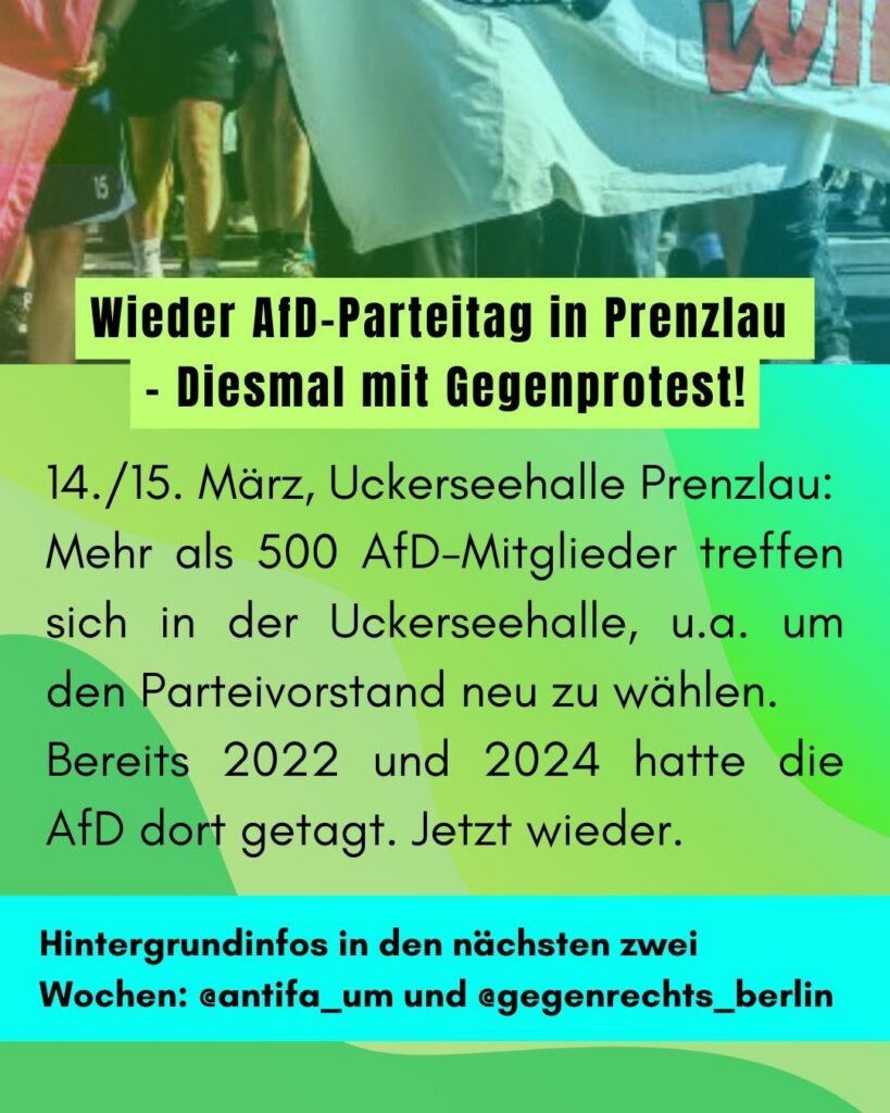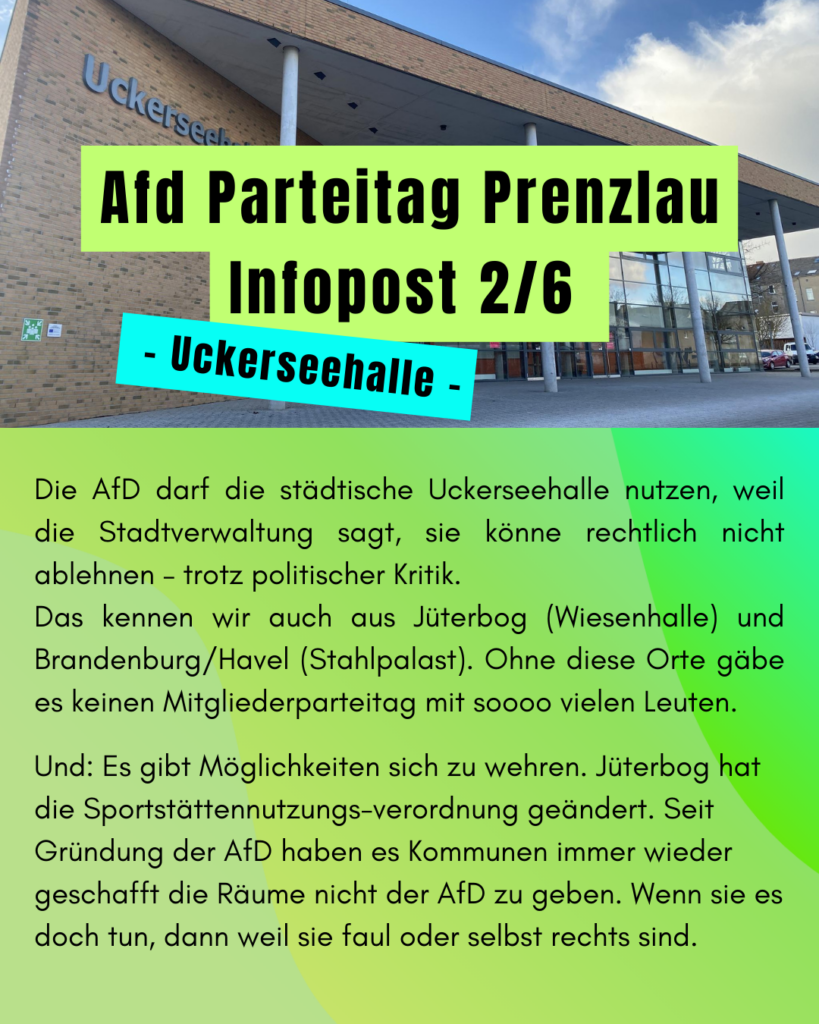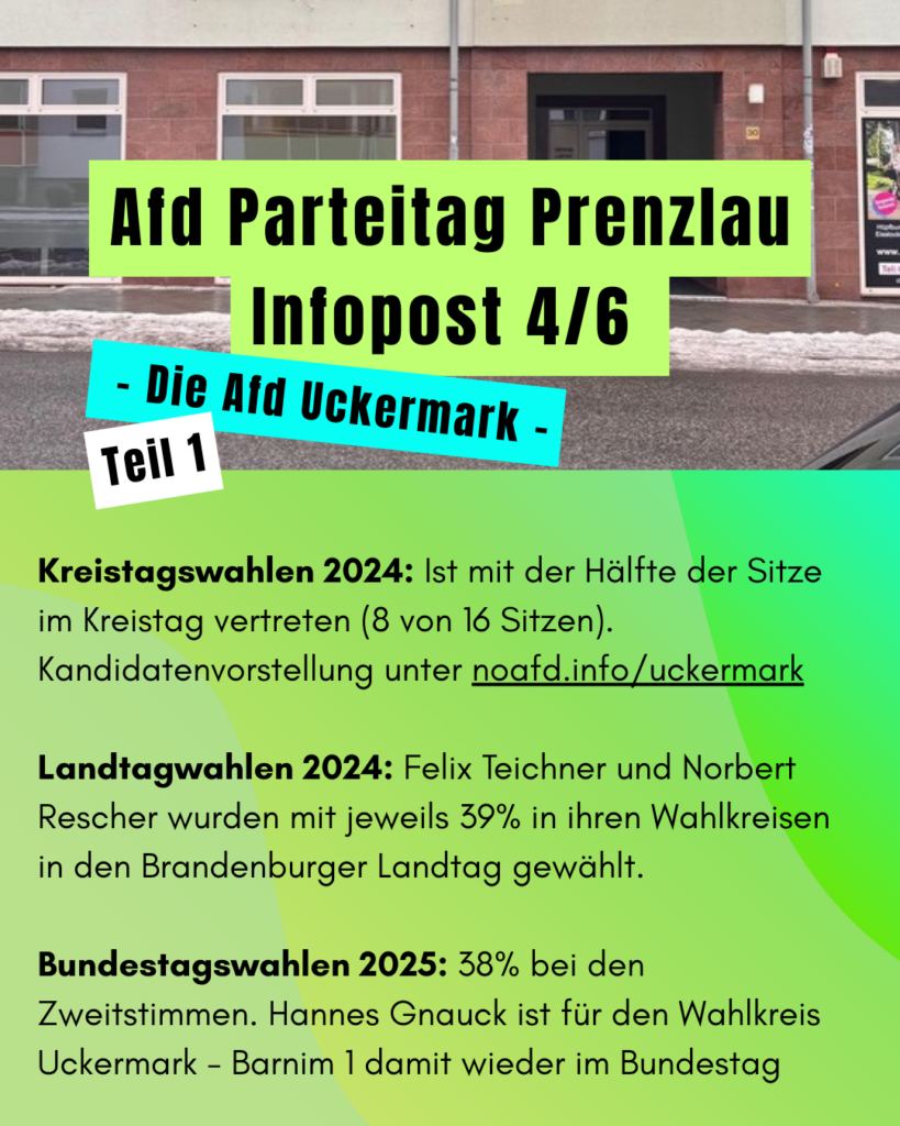 Am 14. März veranstaltete die Brandenburger AfD ihren Parteitag in Prenzlau in der Uckerseehalle. Das solidarische Bündnis gegen Rechts beteiligte sich nicht nur an der Demo am Tag selbst, sondern war auch vorher stärker in die Vorbereitung involviert. So gab es u.a. eine Mobiveranstaltung in Berlin (danke an den Brandenburg-Abend in der Schreina47). Ein Bestandteil im Vorfeld war außerdem eine Insta-Kampagne zur AfD in der Uckermark. Wir teilen die Slides hier nochmal.