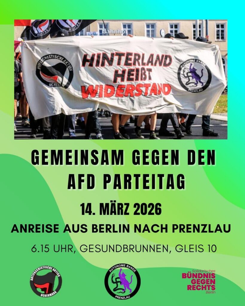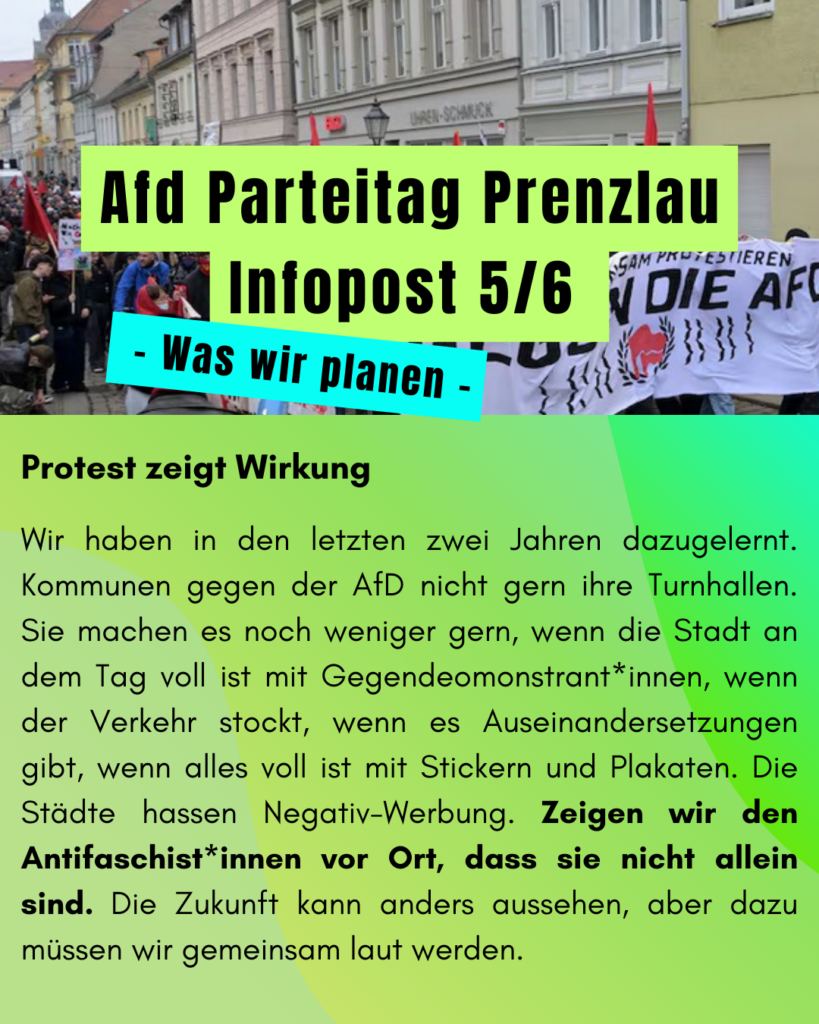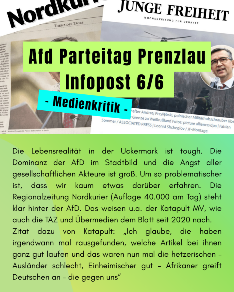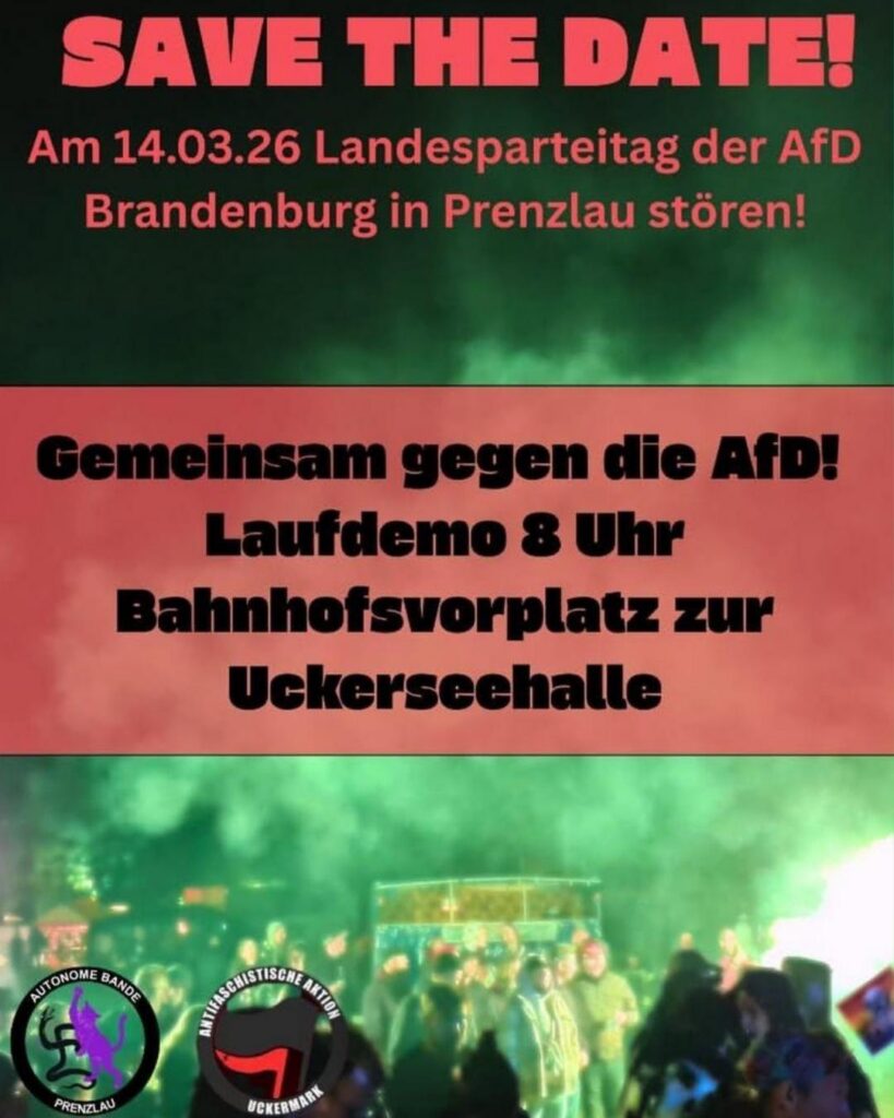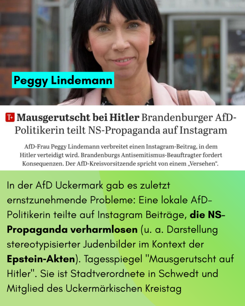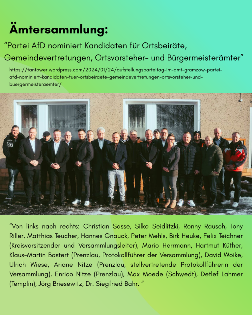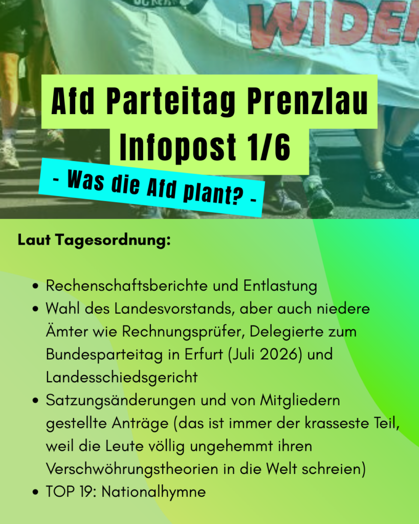 Am 14. März veranstaltete die Brandenburger AfD ihren Parteitag in Prenzlau in der Uckerseehalle. Das solidarische Bündnis gegen Rechts beteiligte sich nicht nur an der Demo am Tag selbst, sondern war auch vorher stärker in die Vorbereitung involviert. So gab es u.a. eine Mobiveranstaltung in Berlin (danke an den Brandenburg-Abend in der Schreina47). Ein Bestandteil im Vorfeld war außerdem eine Insta-Kampagne zur AfD in der Uckermark. Wir teilen die Slides hier nochmal.