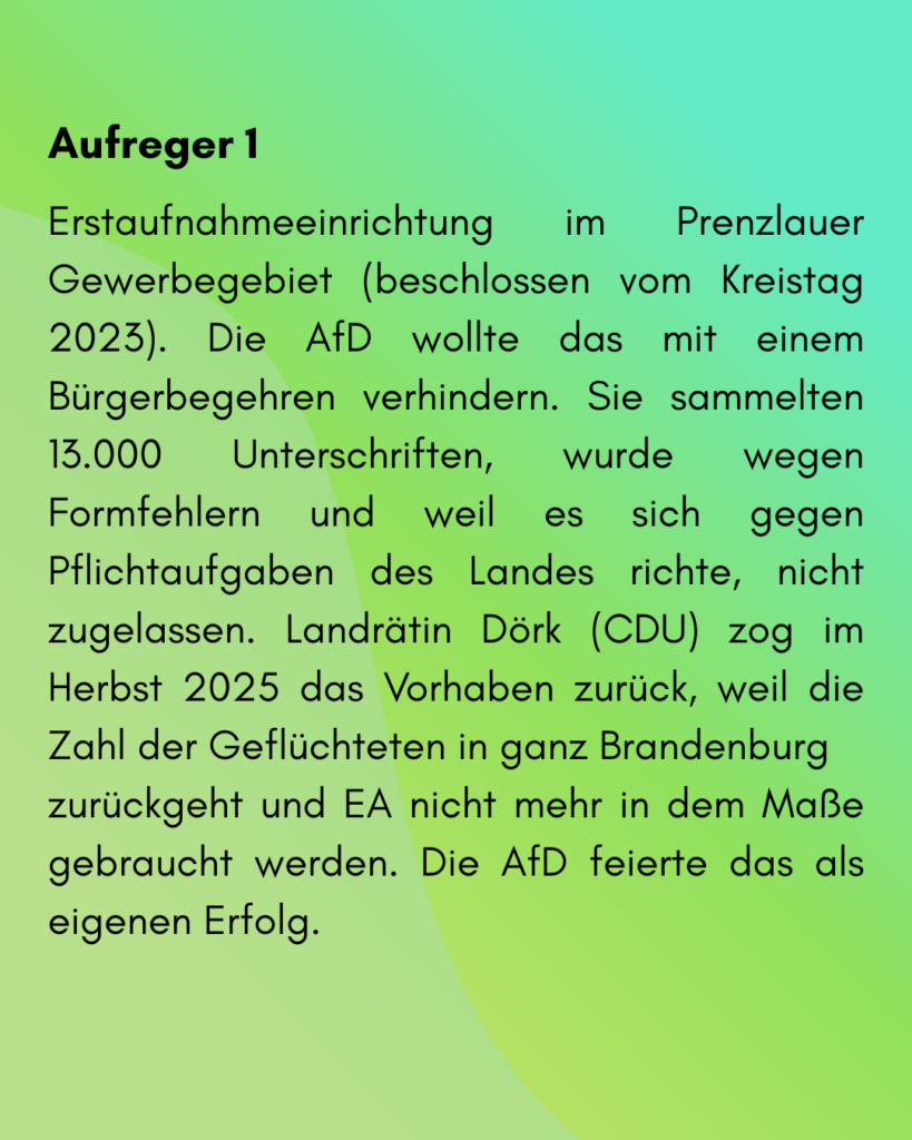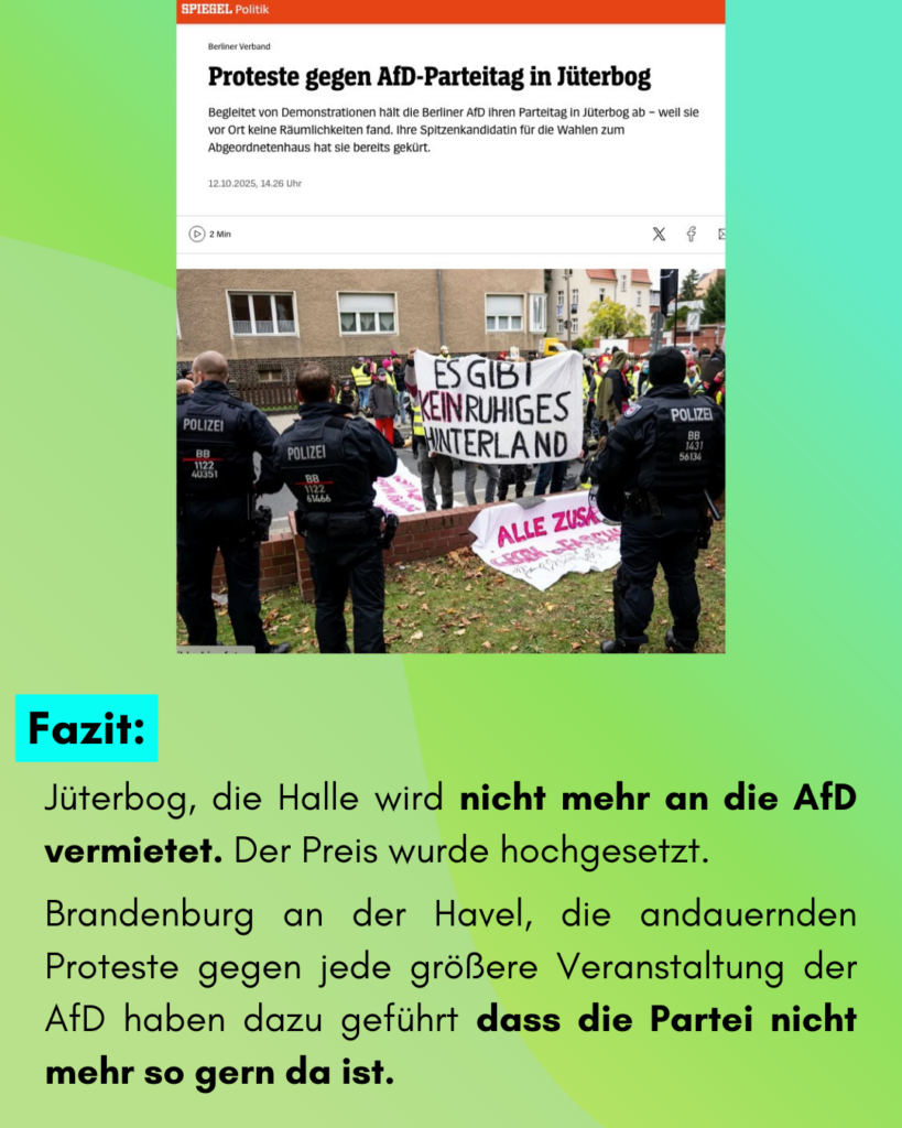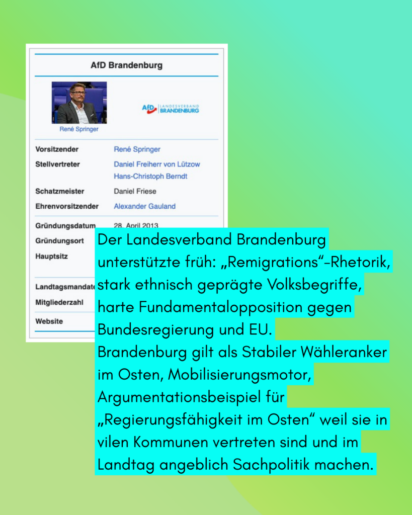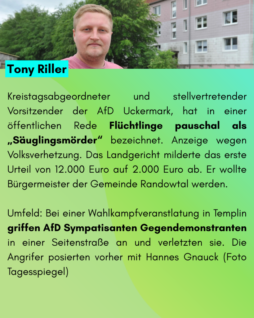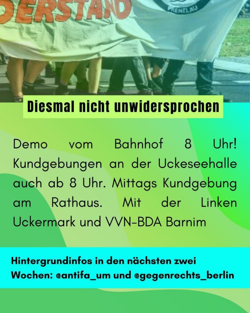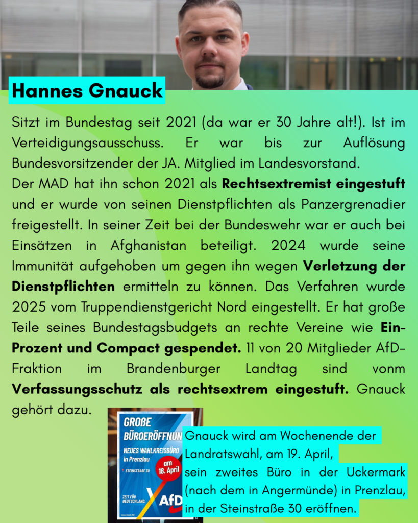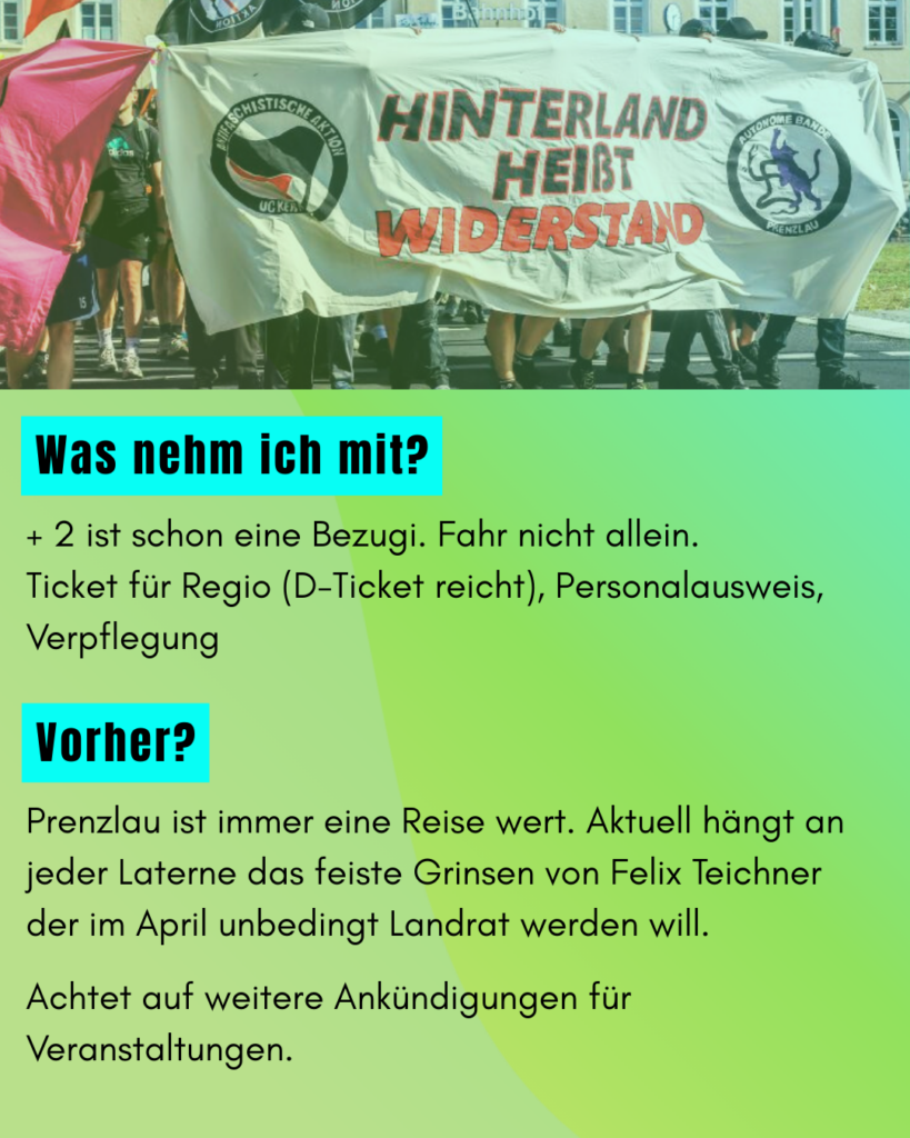 Am 14. März veranstaltete die Brandenburger AfD ihren Parteitag in Prenzlau in der Uckerseehalle. Das solidarische Bündnis gegen Rechts beteiligte sich nicht nur an der Demo am Tag selbst, sondern war auch vorher stärker in die Vorbereitung involviert. So gab es u.a. eine Mobiveranstaltung in Berlin (danke an den Brandenburg-Abend in der Schreina47). Ein Bestandteil im Vorfeld war außerdem eine Insta-Kampagne zur AfD in der Uckermark. Wir teilen die Slides hier nochmal.