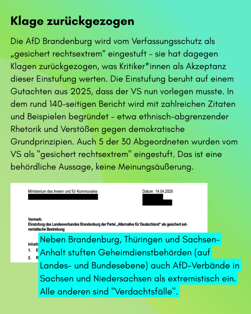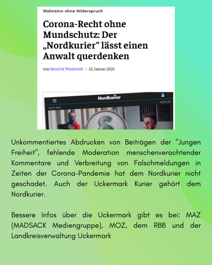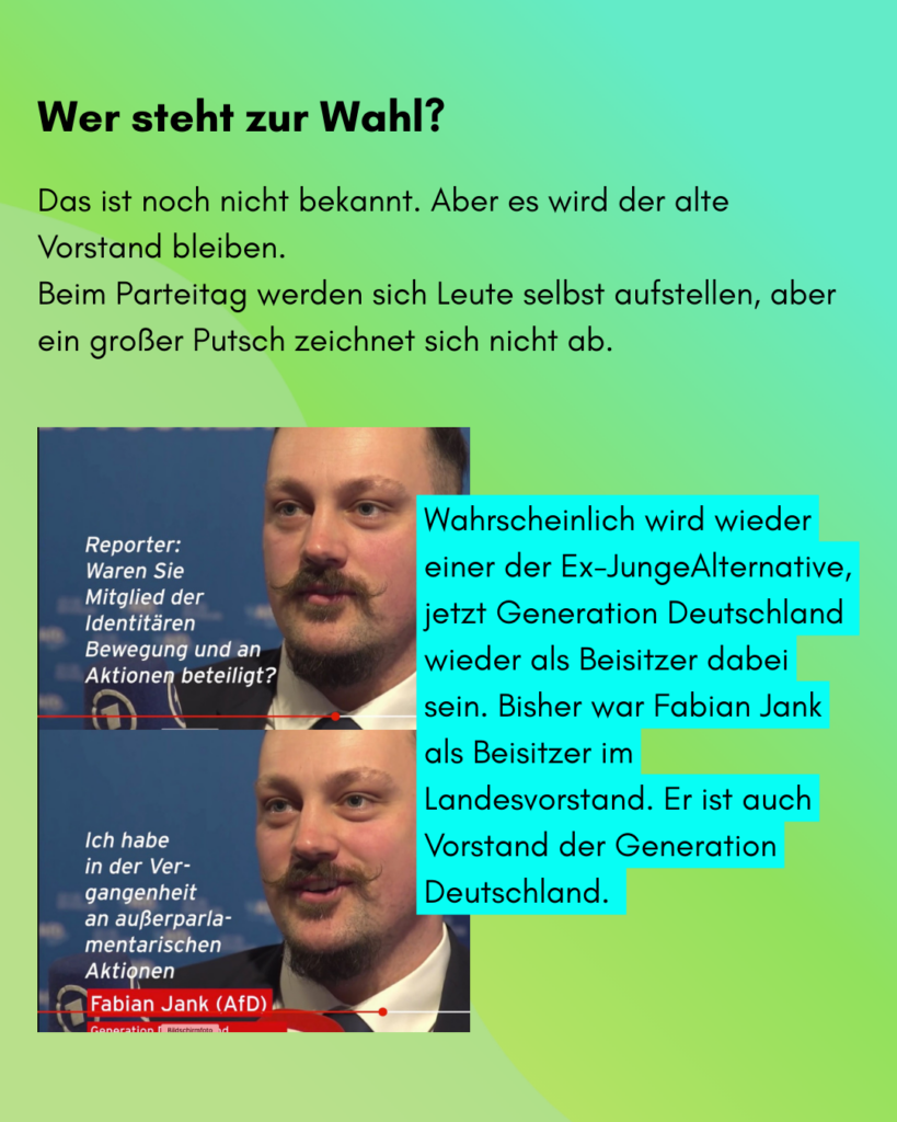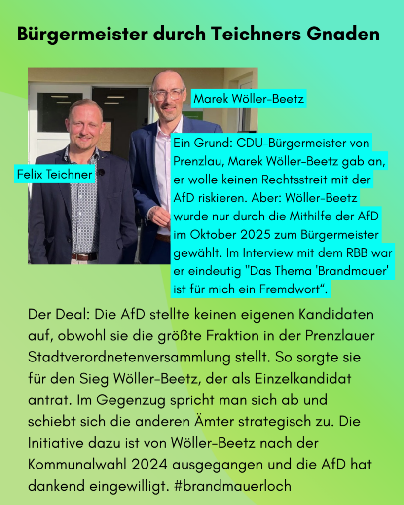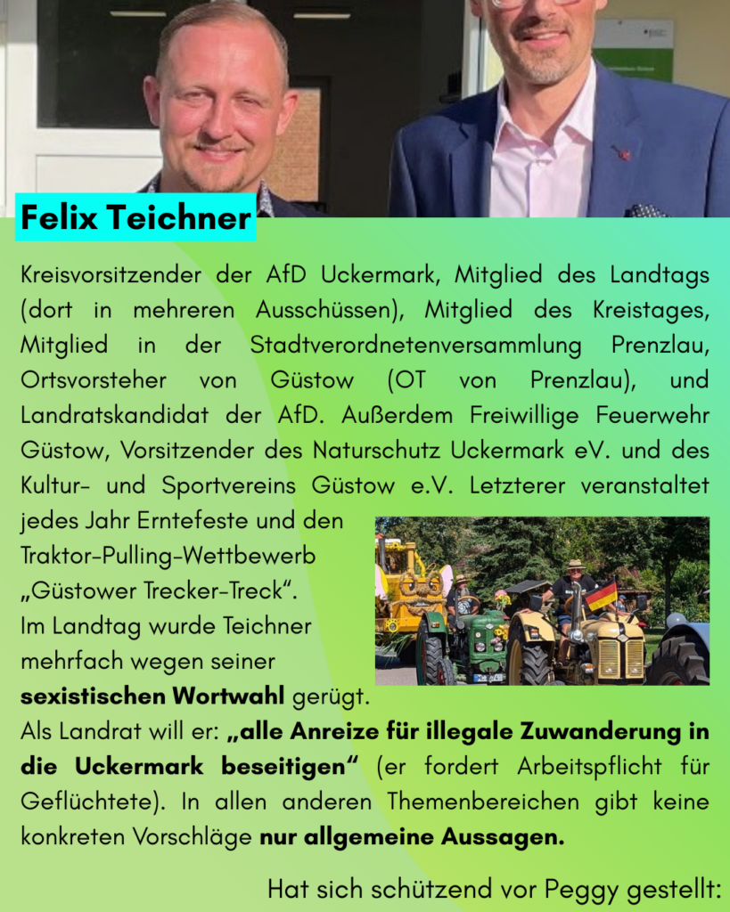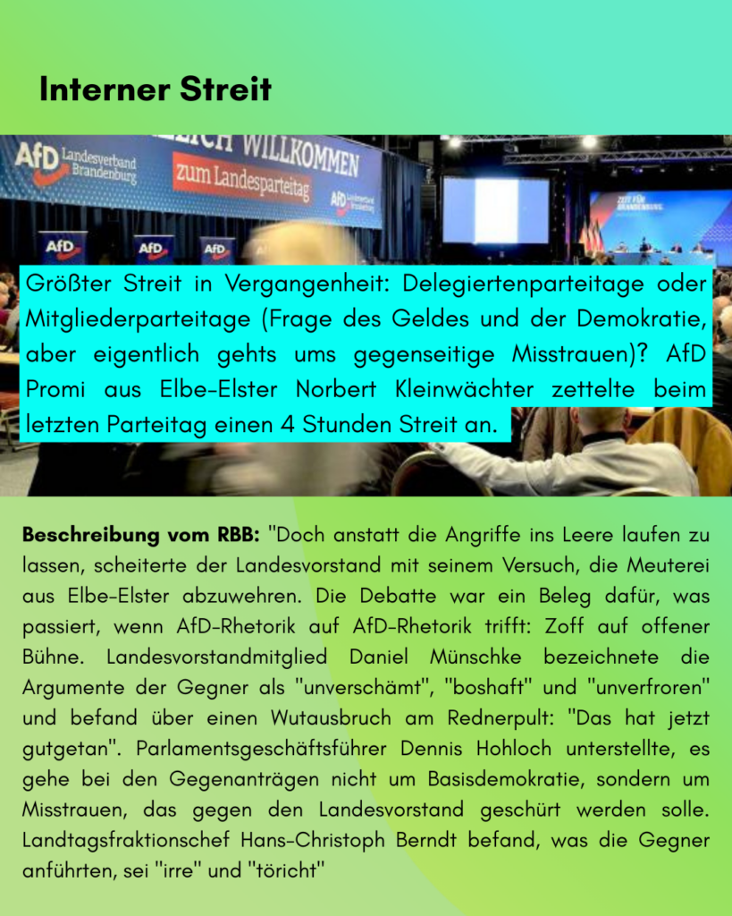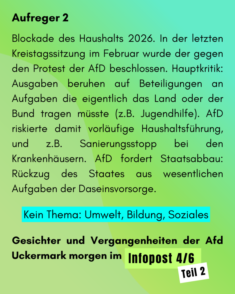 Am 14. März veranstaltete die Brandenburger AfD ihren Parteitag in Prenzlau in der Uckerseehalle. Das solidarische Bündnis gegen Rechts beteiligte sich nicht nur an der Demo am Tag selbst, sondern war auch vorher stärker in die Vorbereitung involviert. So gab es u.a. eine Mobiveranstaltung in Berlin (danke an den Brandenburg-Abend in der Schreina47). Ein Bestandteil im Vorfeld war außerdem eine Insta-Kampagne zur AfD in der Uckermark. Wir teilen die Slides hier nochmal.